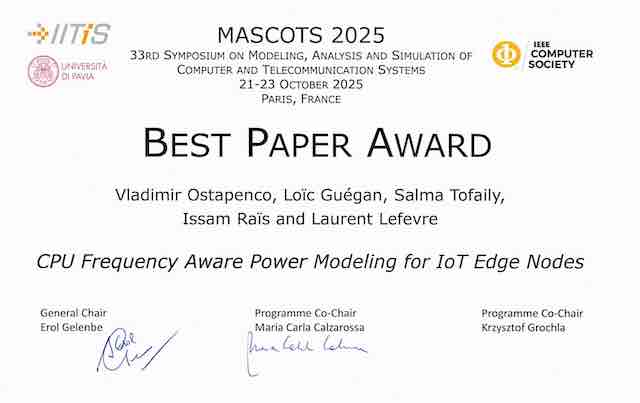 L’article “CPU Frequency Aware Power Modeling for IoT Edge Nodes”, Vladimir Ostapenco, Loic Guégan, Salma Tofaily, Issam Rais and Laurent Lefèvre a reçu le best paper award à la conférence MASCOTS2025 (33rd International Symposium on the Modeling, Analysis, and Simulation of Computer and Telecommunication System) à Paris le 23 Octobre 2025. Cette collaboration a eu lieu dans le cadre du PHC Aurora avec l’Université de Tromso (Norvège).